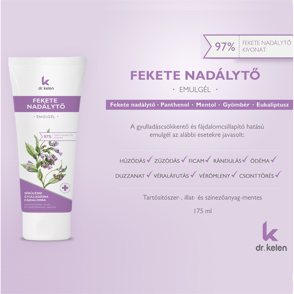 Használata javasolt izmot, ízületet, ínt és csontot érintő zárt sérülés esetén. Húzódás, zúzódás, ficam, rándulás, ödéma, véraláfutás, gyulladás, duzzanat, fájdalom esetén is kifejti jótékony hatását. A gyulladás csökkentő és fájdalomcsillapító hatású Panthenol, regeneráló Allantoin és hűsítő mentol egészíti ki a fekete nadálytő, gyömbér és eukaliptusz gyógynövények népgyógyászati hatását.